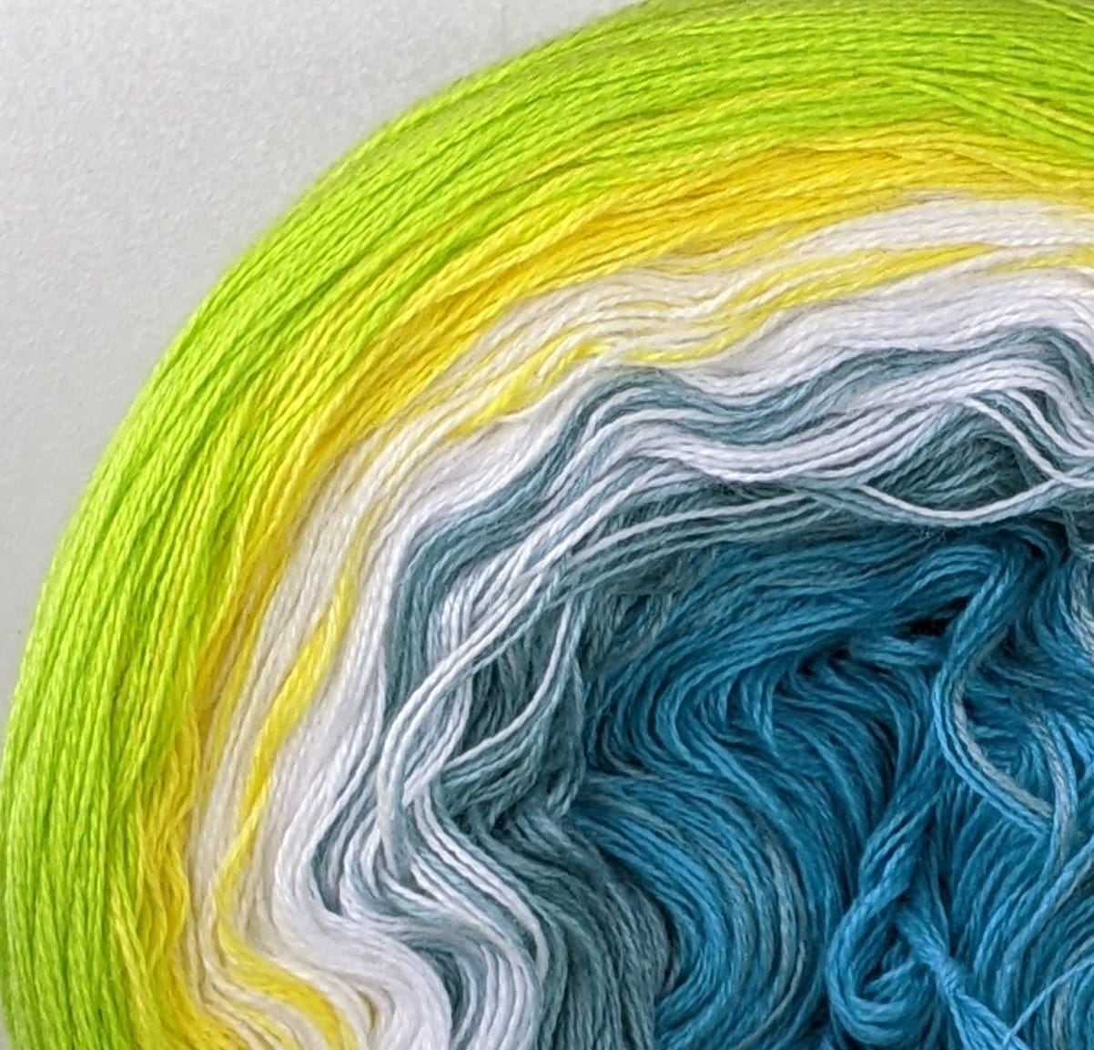 Three or four strands are held together while winding and are not spun together or twisted. Colours are changed at set rates and attached by a tiny knot, creating long slow changes of colour. Perfect for various projects, from scarves and blankets to ponchos and sweaters.