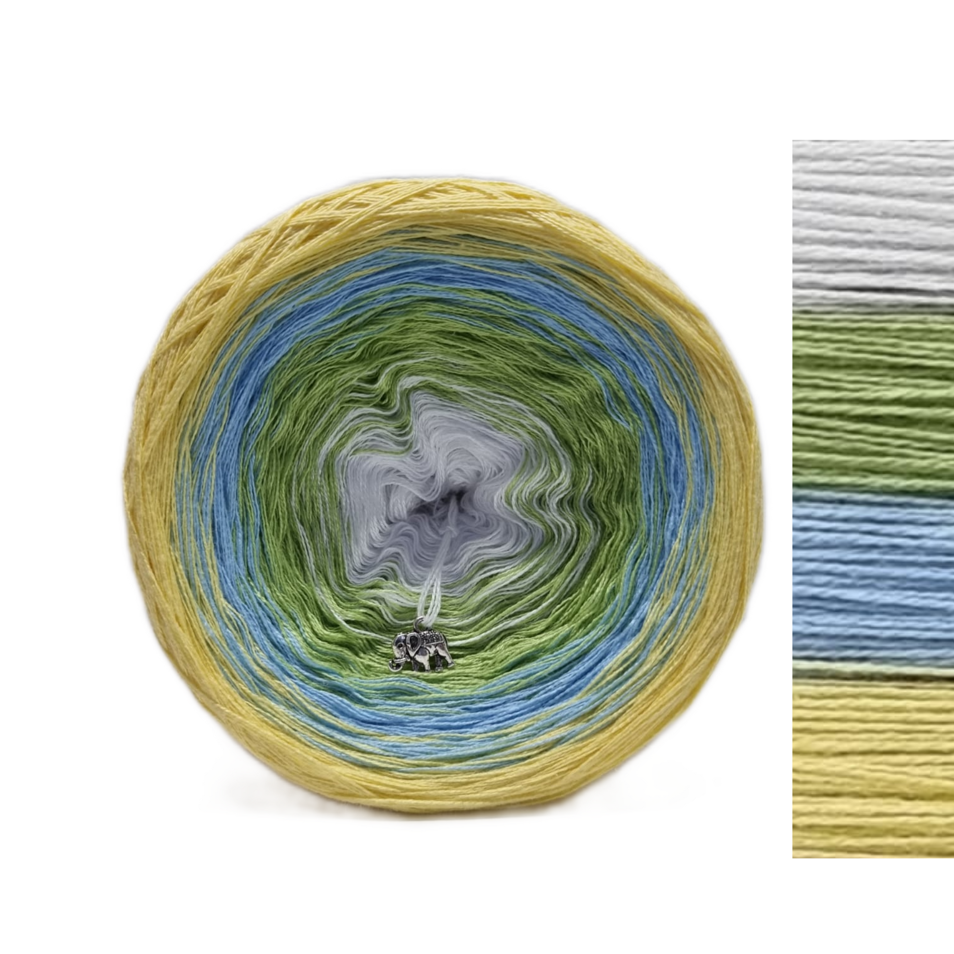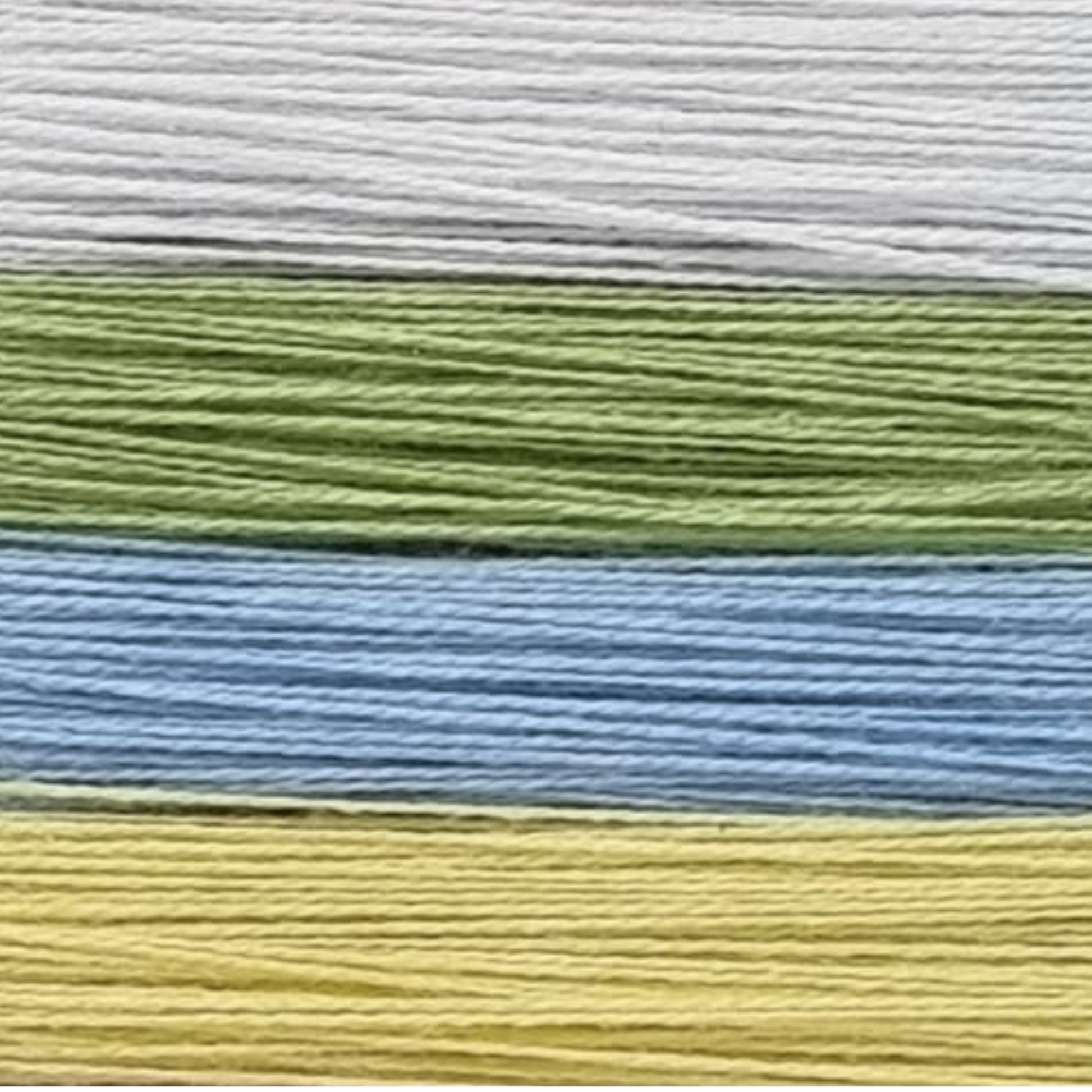 Three or four strands are held together while winding and are not spun together or twisted. Colours are changed at set rates and attached by a tiny knot, creating long slow changes of colour. Perfect for various projects, from scarves and blankets to ponchos and sweaters.